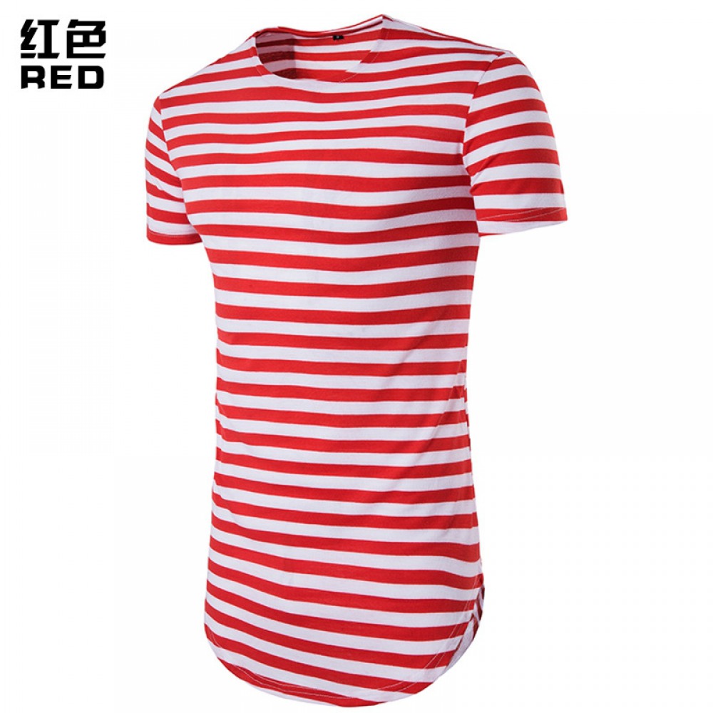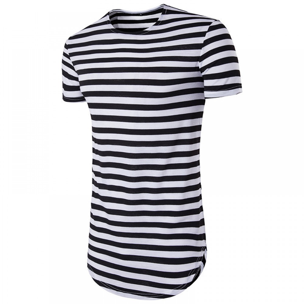 Hip Hop High Street Summer Men's Round Hem High Street Striped Long Short Sleeve T-Shirt